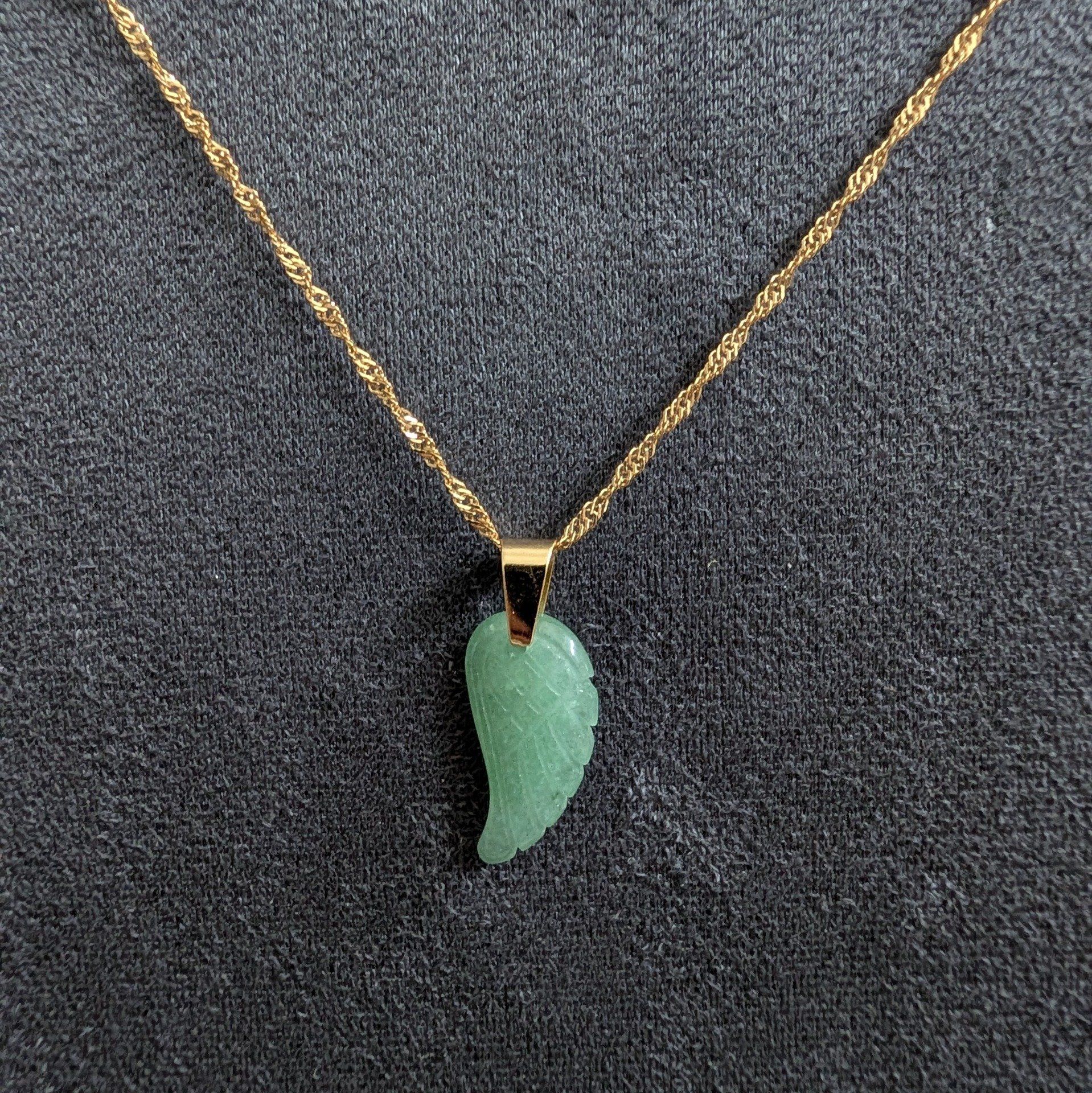 Collier aile d’ange sculptée en aventurine verte naturelle, monté sur chaîne en inox doré. Symbole de douceur, de chance et de protection spirituelle.