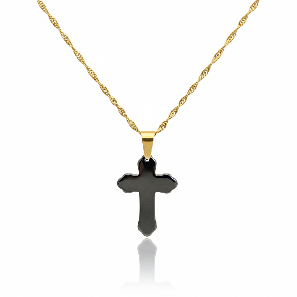 Collier croix en hématite naturelle, monté sur chaîne en inox doré. Pierre d’ancrage et de protection, symbole de force intérieure et d’équilibre.