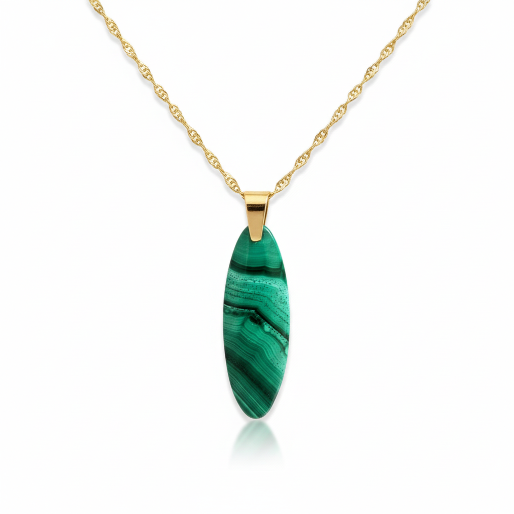 Collier en malachite naturelle monté sur chaîne en inox doré. Pierre d’équilibre et de transformation, chaque pièce est unique par ses magnifiques bandes vertes.