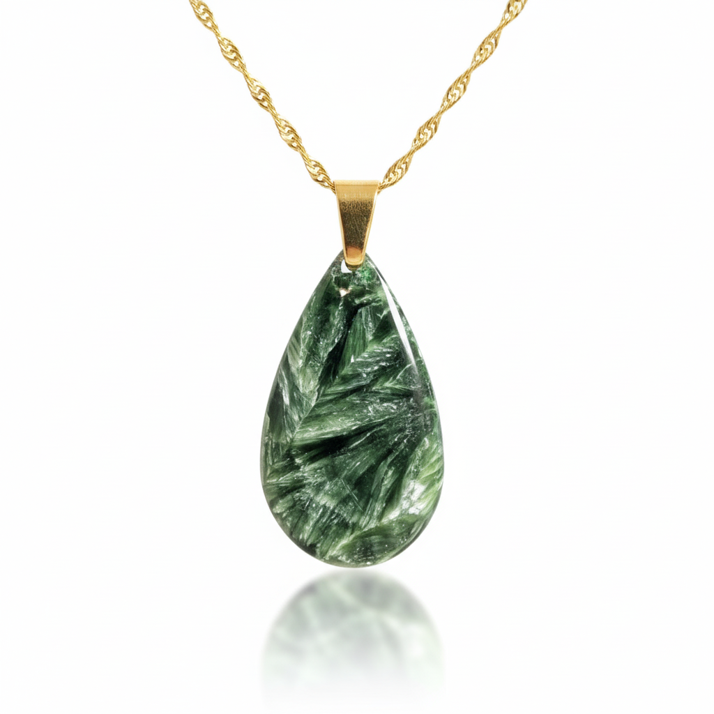 Collier goutte en séraphinite naturelle monté sur chaîne en inox doré. Pierre spirituelle rare, symbole de guérison, de paix intérieure et d’élévation.