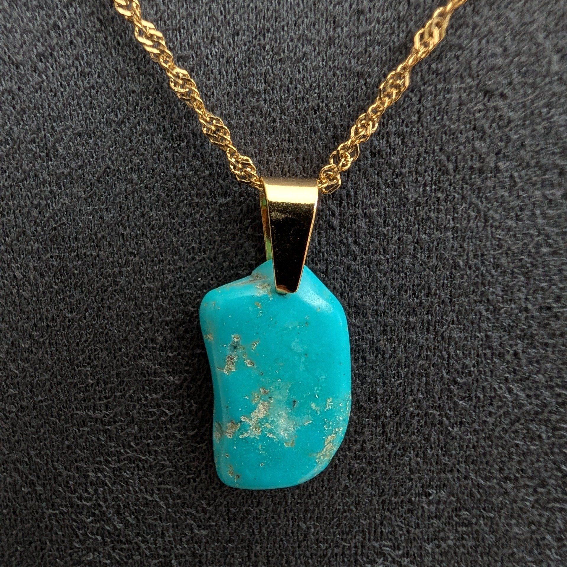 Collier en turquoise d’Arizona monté sur chaîne en inox doré. Pierre naturelle aux vertus de protection et d’apaisement, chaque pièce est unique.
