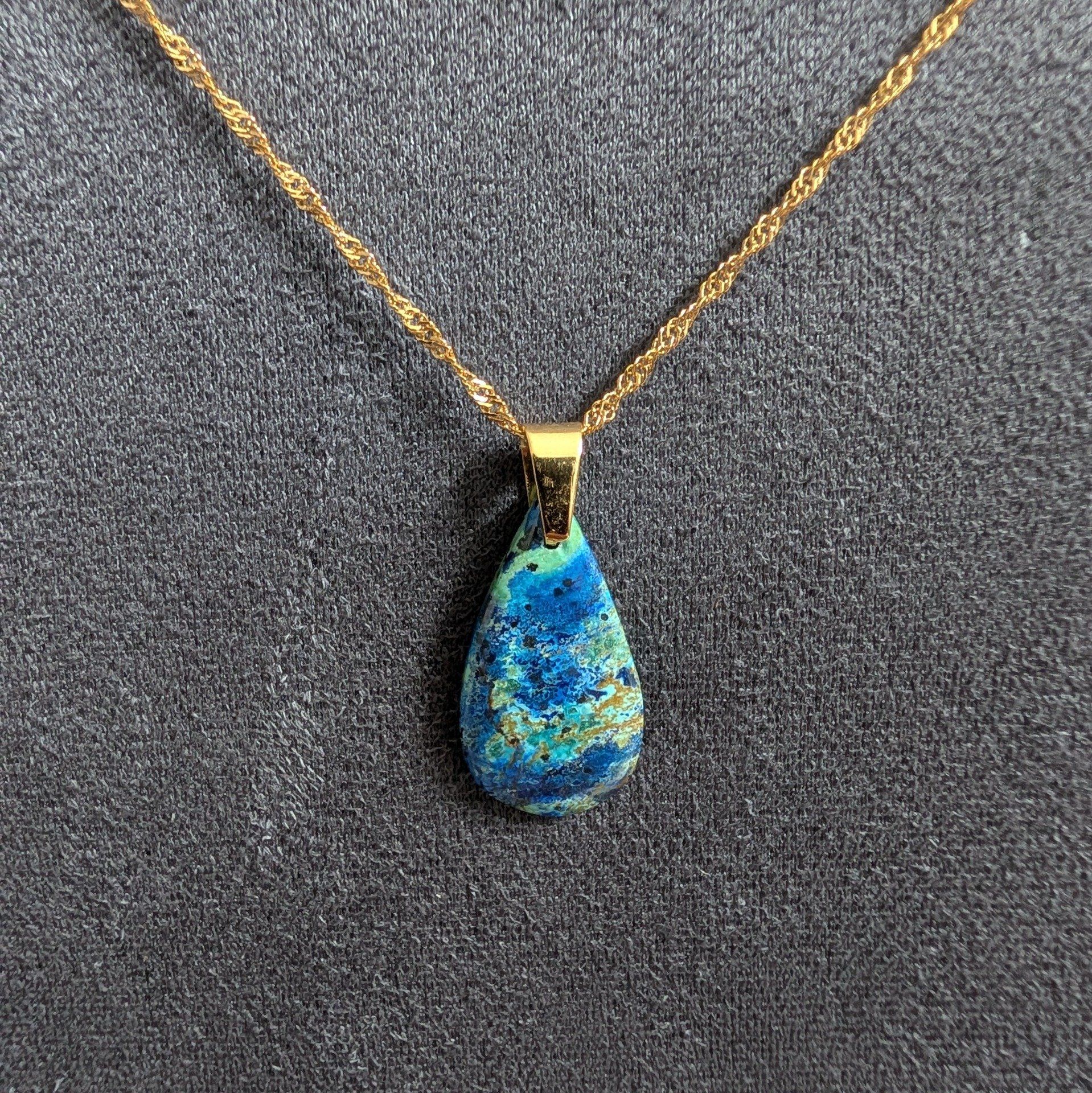 Collier goutte en azurite Blue Bird naturelle, monté sur chaîne en inox doré. Pierre d’intuition et d’apaisement, aux reflets bleus profonds et verts intenses.