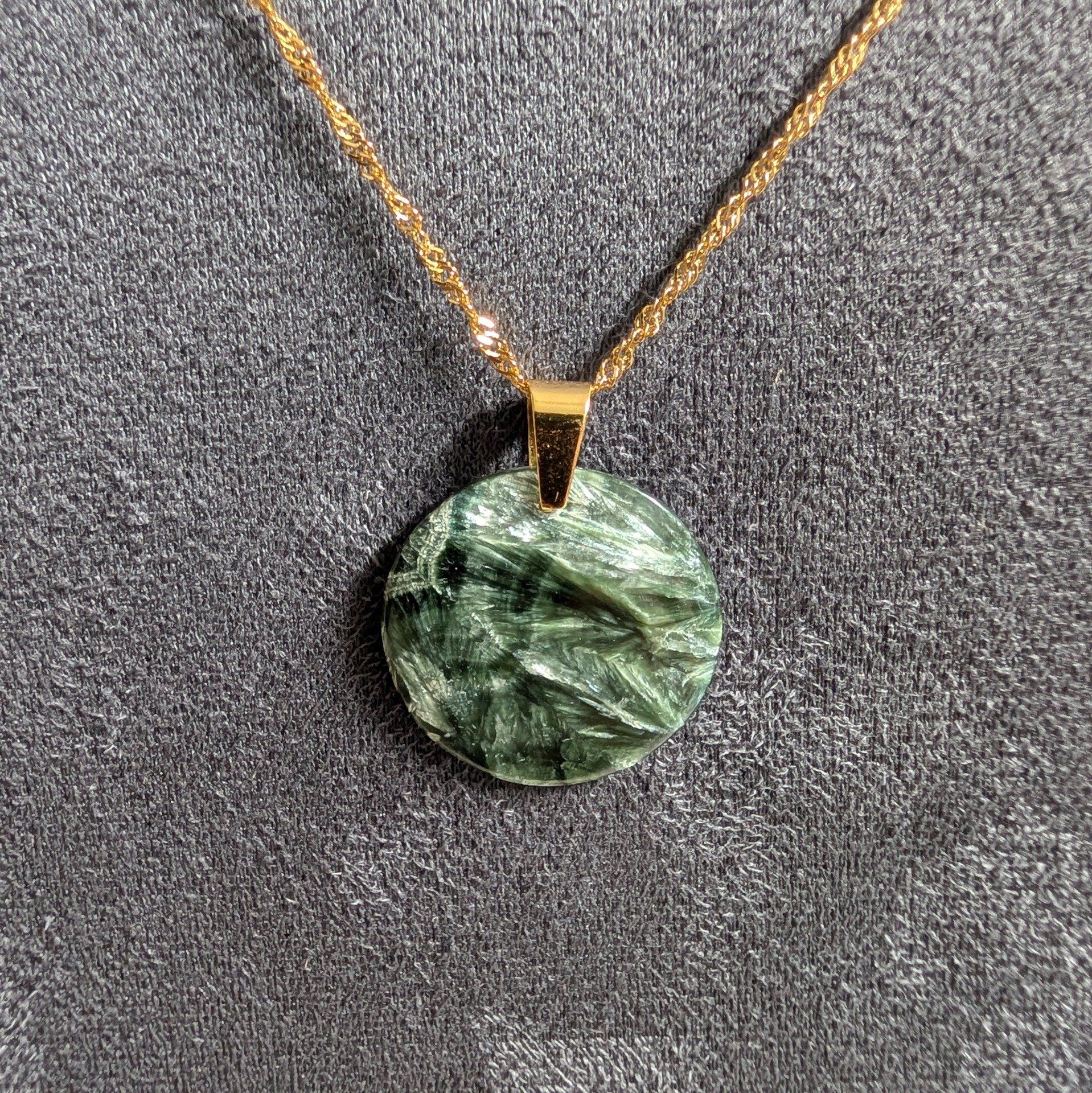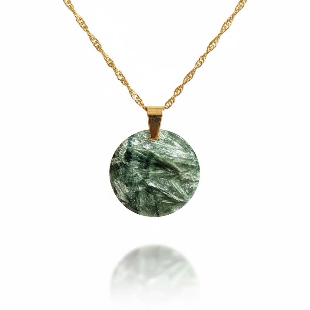 Collier rond en séraphinite naturelle monté sur chaîne en inox doré. Pierre rare et spirituelle, symbole de paix intérieure et d’énergie angélique.