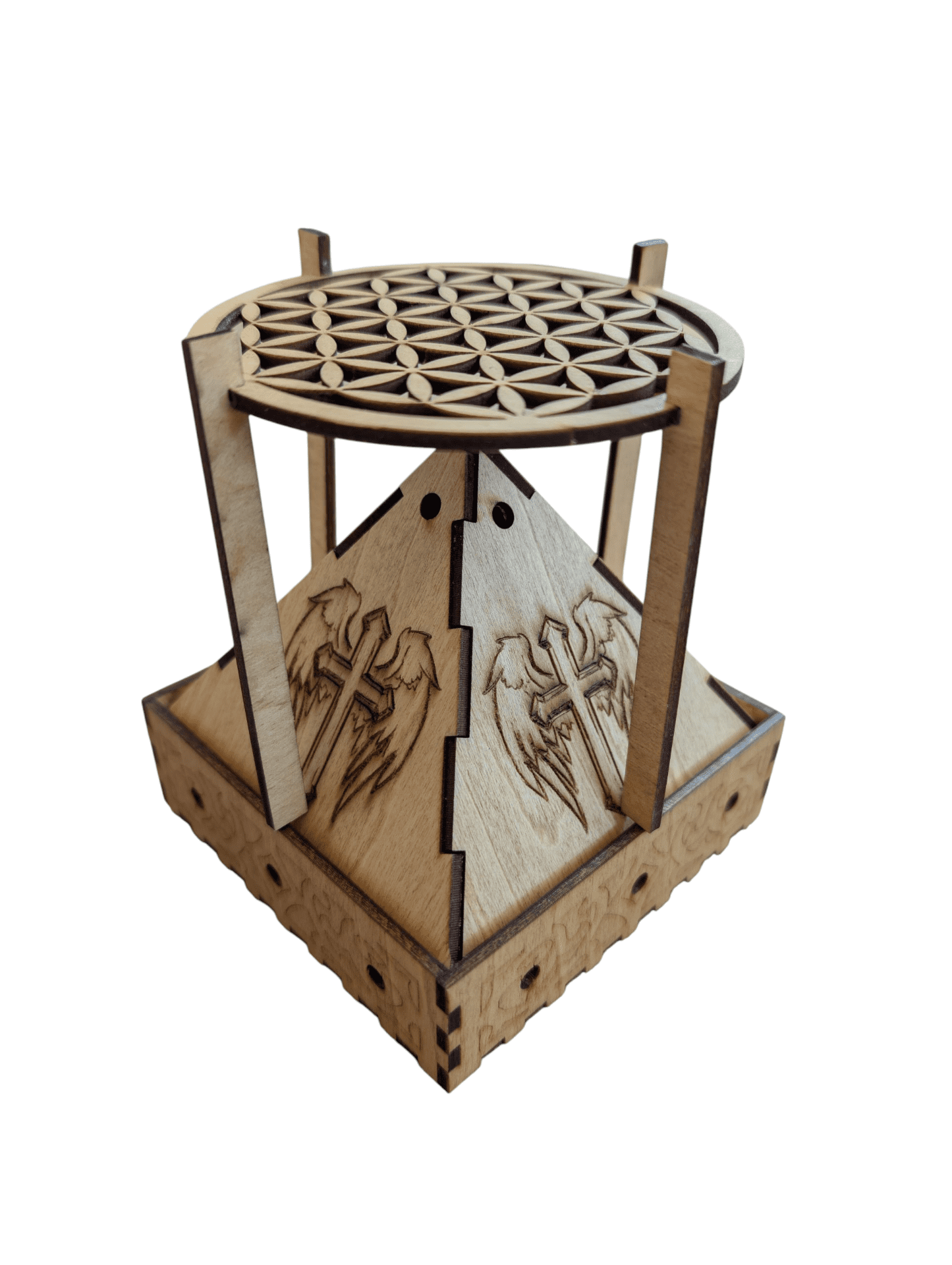 Encensoir pyramide en bois gravé d’une croix ailée et du symbole de la Fleur de Vie. Idéal pour la purification, la méditation et le rechargement énergétique. Utilisation uniquement avec cônes d’encens.