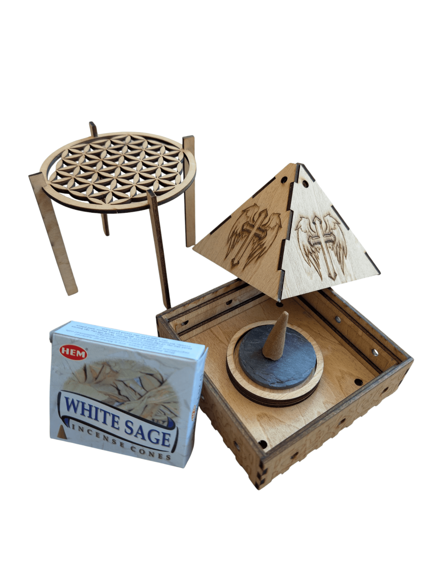 Alliez force spirituelle et harmonie énergétique avec notre encensoir pyramide Croix Ailée & Fleur de Vie, une création en bois naturel gravé au laser, symbole de protection et de lumière.