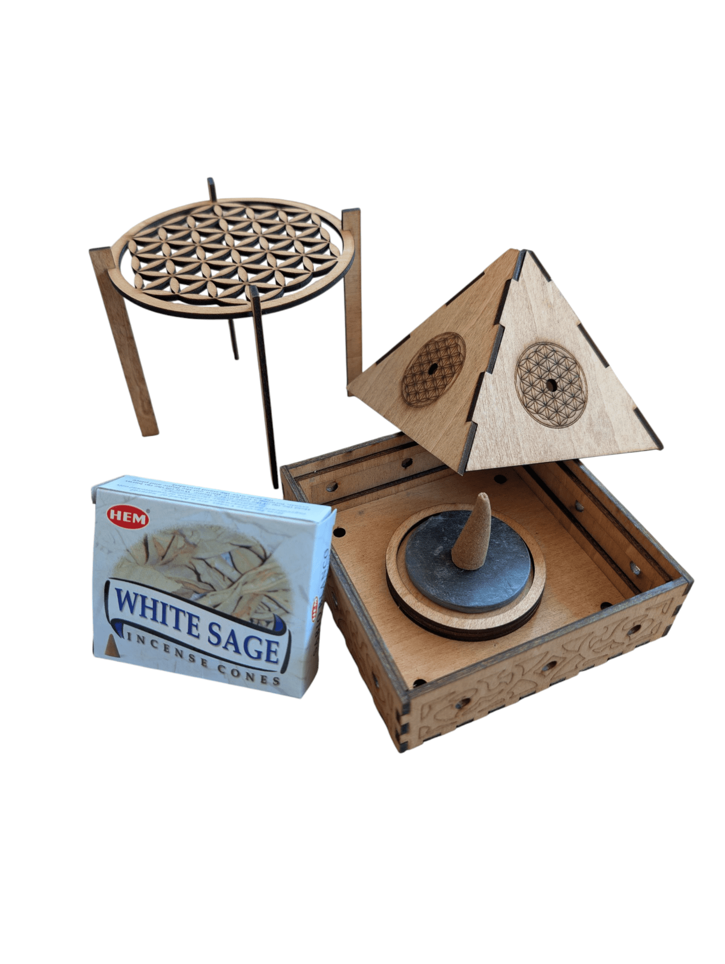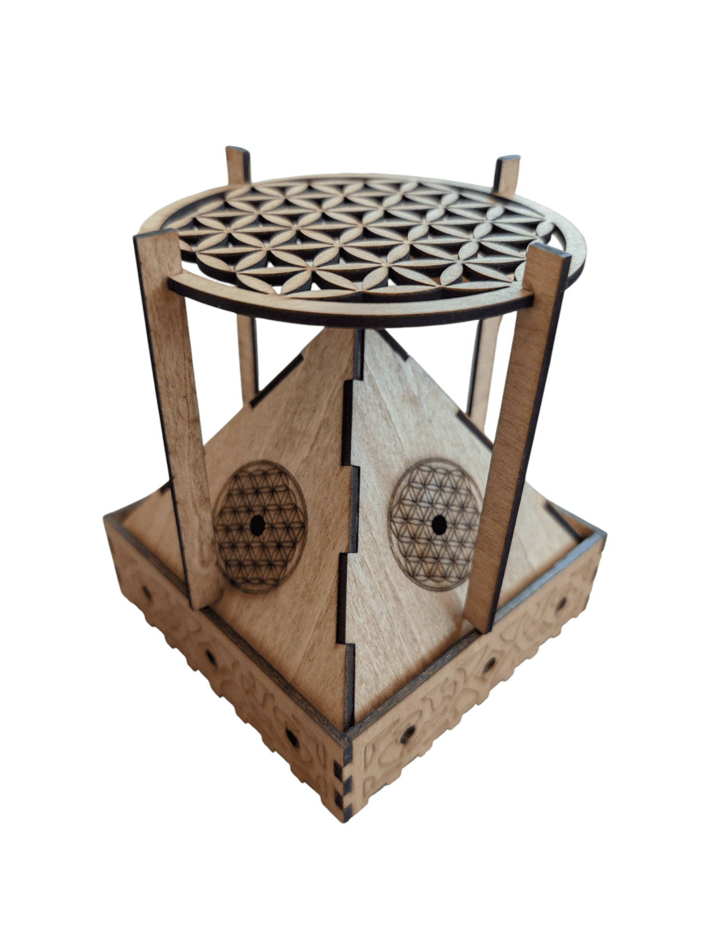 Encensoir pyramide en bois gravé du symbole sacré de la Fleur de Vie. Idéal pour la purification, la méditation et le rechargement énergétique. Utilisation uniquement avec cônes d’encens.