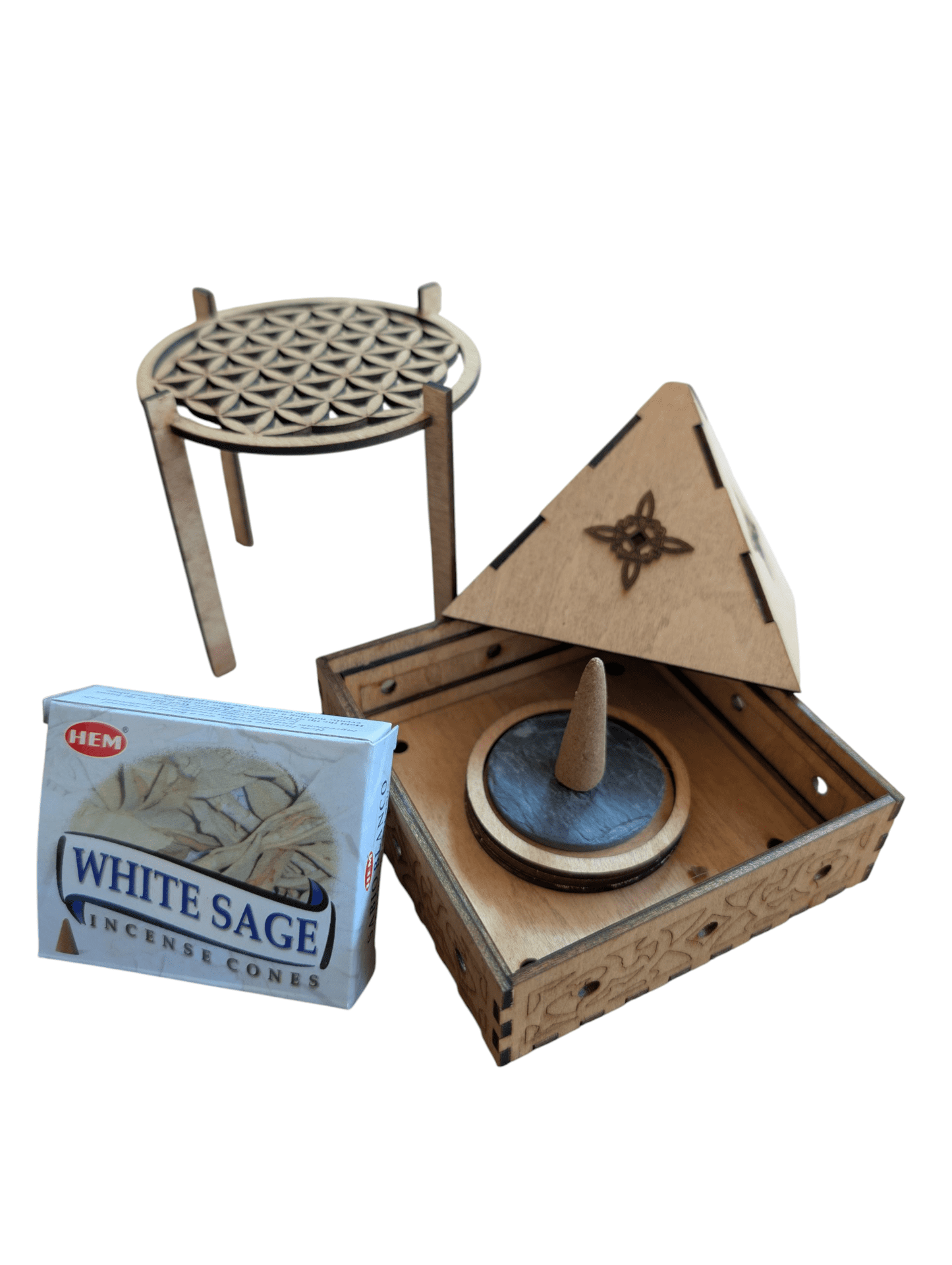 Encensoir pyramide en bois gravé du Nœud de Sorcière et de la Fleur de Vie. Idéal pour la purification, la méditation et le rechargement énergétique de vos pierres.